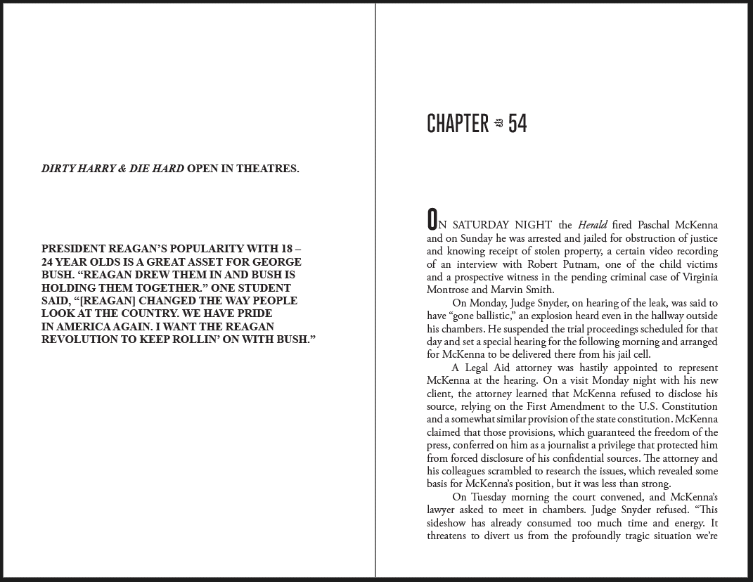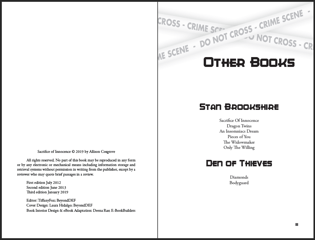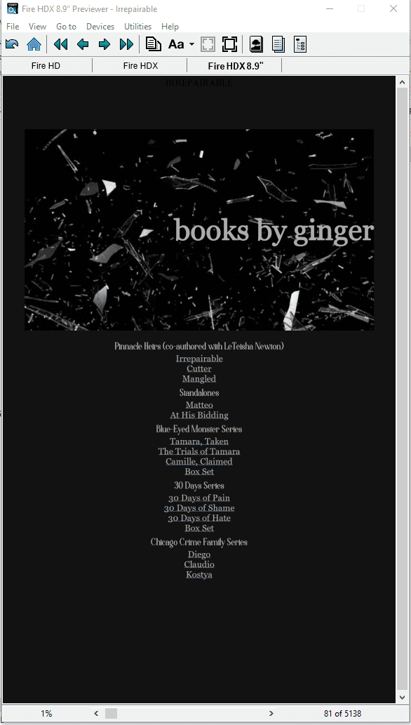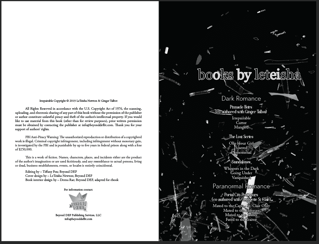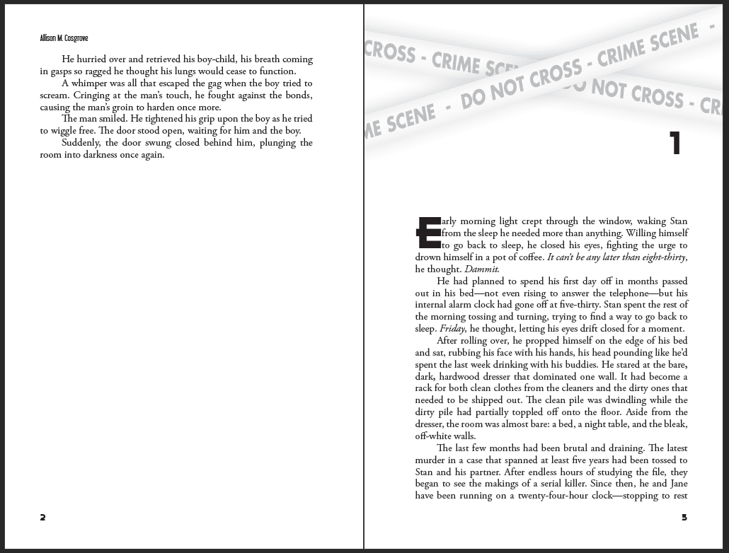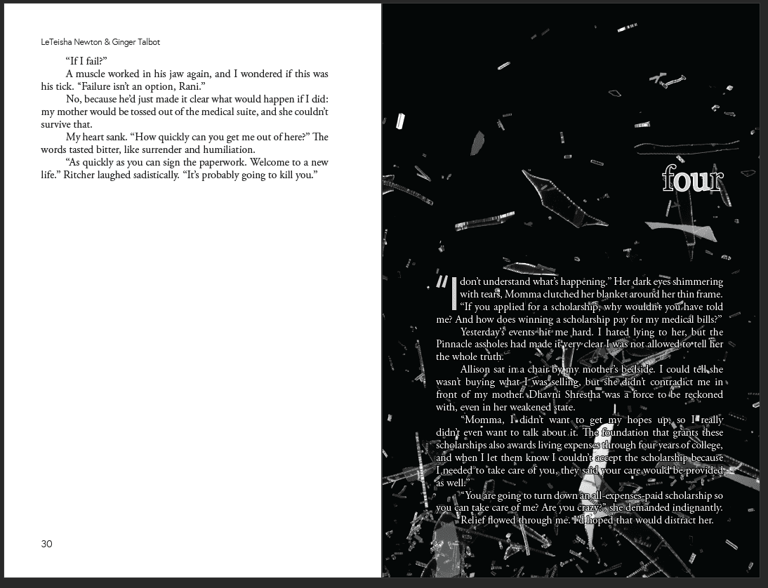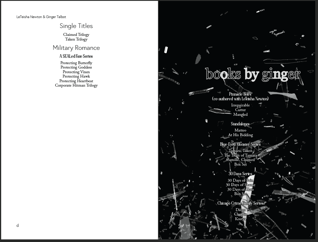 Across genres, these projects feature custom-designed print books and ebooks, with unique chapter openers, interior design elements, and tailored typography for a polished, immersive reading experience.