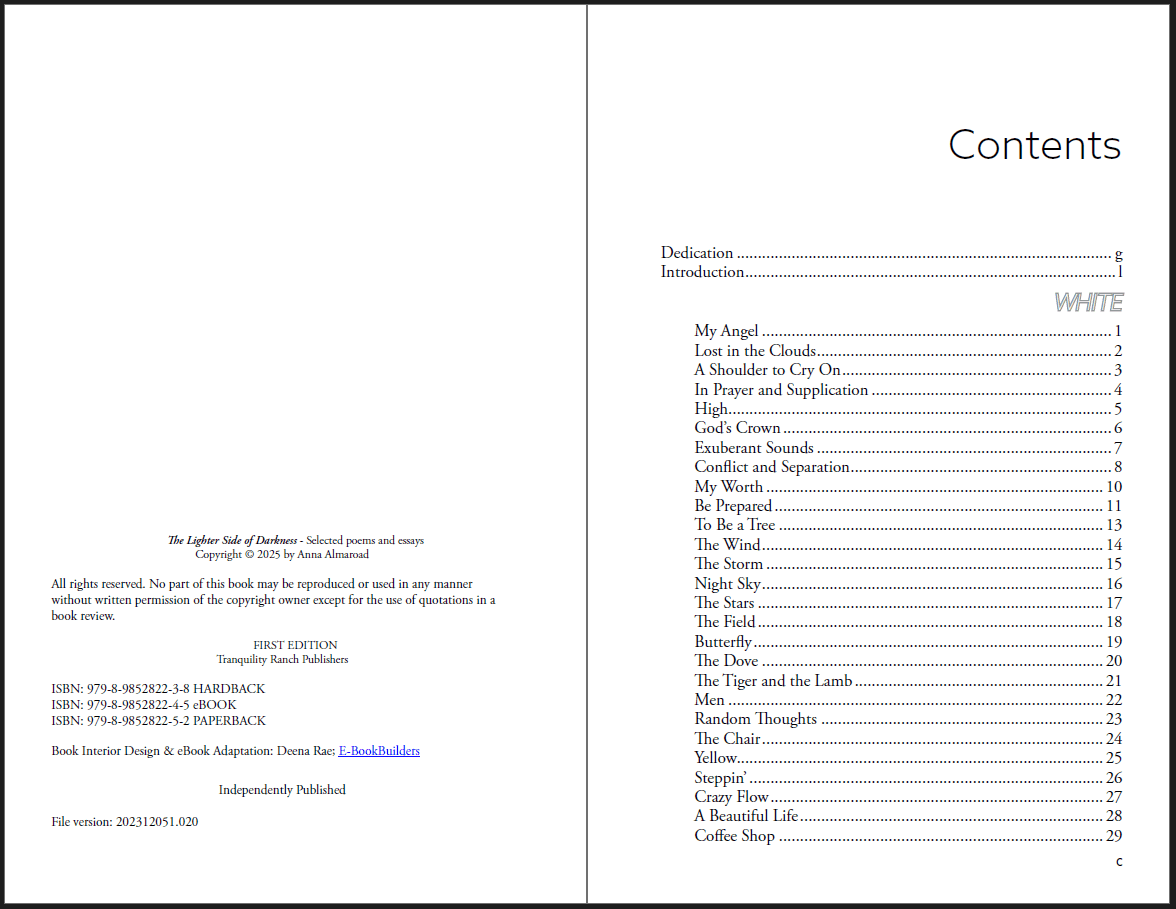 Note: If a cover is shown as the first image in a project preview, it was designed by eBookBuilders along with the interior and ebook formatting—except for children’s books, where covers were provided by the author.